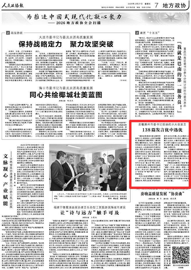 “调研成果得到市委主要领导高度认可、现场批示,让我们倍感振奋,更激励我们调研再深入、建言再精准、履职再有为。”近日,安徽省滁州市政协七届五次会议举行第二次全体会议,13位政协委员代表民主党派、界别、政协专委会,紧扣滁州发展大局作大会发言,得到市委主要领导现场批示,要求各地各部门在推动“十五五”规划实施中研究好、吸纳好、落实好。